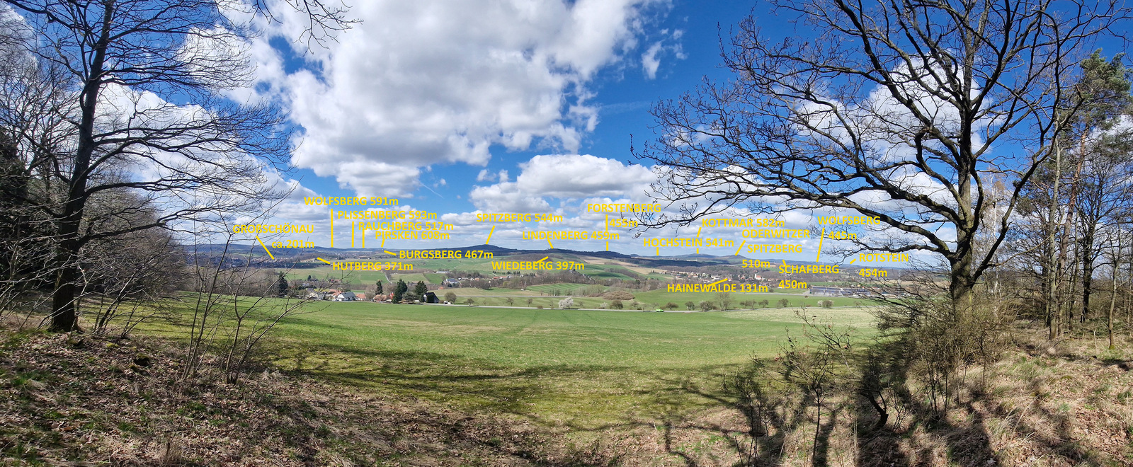 Von dieser Bank aus reicht der Blick über Bertsdorf-Hörnitz hinweg bis nach Zittau und weiter zur markanten Silhouette der Tafelfichte. Die weite Landschaft verbindet die Täler der Oberlausitz mit den bewaldeten Höhen an der deutsch-tschechischen Grenze. Der auch König des Isergebirges genannte Berg liegt südlich von Neustadt an der Tafelfichte und ist dessen Hausberg.