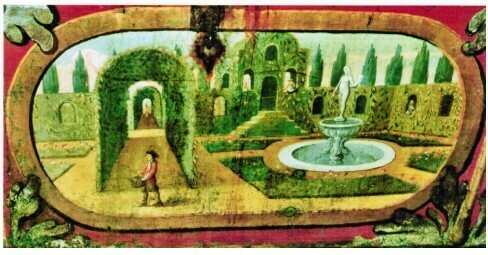 Auf der linken Seite des Bildes blickt der Betrachter durch einen gewölbten Laubengang, der den Brunnenhof zu dieser Seite hin abschließt und sich in seiner Verlängerung Ferne in die Landschaft öffnet. Ein Mann mit Dreispitz trägt an dessen Eingang einen gefüllten Korb vorbei.