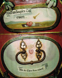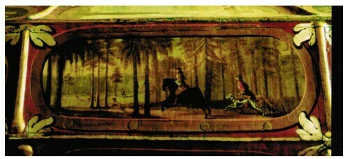 Auf dem Bild darunter auf dem Sarg-Korpus kommt ein Herr mit Hut in Justeau-Corps mit Spitzen- manschetten auf einem geschwungenen Wege von einem mit doppelter Mauer befestigten Bergschlosse auf uns zu. Neben dem Schloßberg steht eine Kapelle mit Dachreiter. Aus dem Torbogen vor dem Torwege kommt ein Reiter auf einem Schimmel mit einem Hund, ein weiterer folgt auf einem dunklen Pferd. Die Landschaft im Hintergrund ist hügelig.