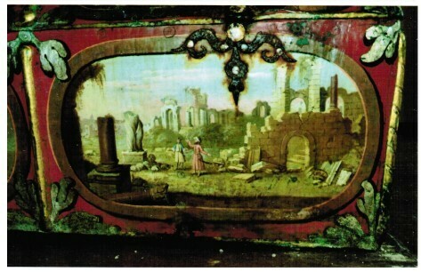 Ein weiteres Reisemotiv könnte mit dem Ruinen-Bild an der rechten Ecke dieser Sargseite intendiert sein: In einem Ruinenfeld diskutieren ein europäisch gekleideter Herr mit einem durch Turban, weiten rosa Mantel und gekrümmtes Schwert als Osmanen gekennzeichneten Mann. Der Maler hatte offenbar keine reale Anschauung von griechischen Ruinen. Die beiden Männer stehen zu Füßen eines weiblichen Torso. Links begrenzt ein abgebrochener Bogen und eine abgebrochene Säule, deren Oberteil mit Kapitell am Boden liegt.