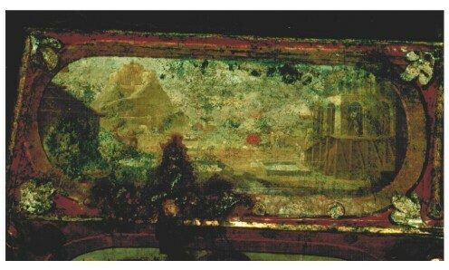 Hier weitet sich das Gewässer zu einer Wasserfläche in der sich Häuser spiegeln. Der Talkessel kann von jenem in Oybin inspiriert sein. Der Maler scheint eine Vorliebe für spiegelnde Wasserflächen zu haben. Ebenfalls auf dem Sargdeckel befindet sich über dem Bild mit dem durch Hecken gegliederten Park ein stark beschädigtes Landschaftsbild.