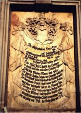 Das Motiv der navigatio findet sich auch an der Nordseite der Kyaw’schen Gruft: die rechte Giebelfigur (Unruhe) hält ein Segel über sich.