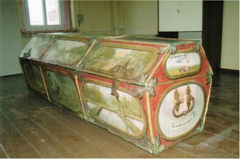 Der Sarg hat die Grundform eines ungleichseitigen sechseckigen Prismas bei dem drei Flächen auf den Sargdeckel entfallen. Die Seiten sind in je drei Flächen gegliedert auf denen die Einzelbilder sich vom roten Untergrund mit je eigenen Rahmungen abheben. Die Stirnseiten zeigen auf Korpus- und Deckelfläche je ein Bild.