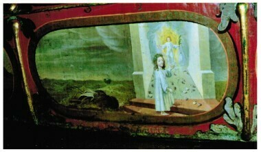 Die Fortsetzung findet sich auf dem Motiv auf der Gegenseite: Das Boot liegt am Fuße einer Treppe, auf die ein leuchtender Gang aus dem Himmel herab in die stürmische Meeres-Szene reicht. Auf der Treppe steht eine bekränzte, mit langem weißen Hemde bekleidete Gestalt. Sie ist im Begriffe, den Gang zu betreten, sieht aber zum Betrachter zurück und weist ihm mit einem Arm den Weg hinauf. Auf einem kindlichen Körper sitzt ein bartloser Männerkopf mit schulterlangem gelockten Haar. Ein Portrait des Verstorbenen? Oben wartet vor goldenem Hintergrund ein Engel mit Palmzweig. Der Weg ist (mit Rosen? cf. Dr. Heinke) bestreut.