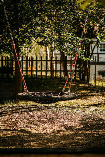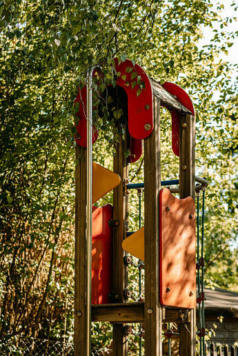 Nur durch einen kleinen Nebenweg sind wir von unserem großen Garten getrennt, der viel Platz für Spiel und Spaß bietet. Er ist mit zwei Sandkästen, Klettergerüsten und Kletterhäuschen, einer Rutsche, einem Trampolin und Schaukeln- TÜV- gerecht ausgestattet. Aber auch ein Holz.- sowie Wasserspielplatz steht den Kindern unserer Einrichtung zur Verfügung.