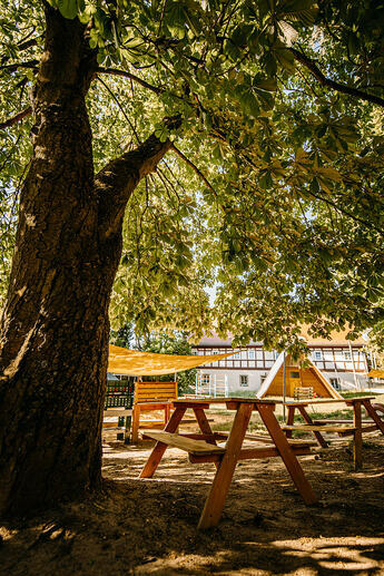 Die Hortkinder können den ehemaligen Schulhof, der 2013 saniert und neu gestaltet wurde, als Spielplatz nutzen, der mit neuen Spielgeräten u.a. einer Schaukel , Tischtennisplatte etc. und viel Freiflächen, allen Altersgruppen entsprechend attraktiv gestaltet wurde. Wiesenflächen laden zum Verweilen ein, ebenfalls eine Rundbank am Eingang zum Hort. Am Wasserspielplatz kann das Wasser unterschiedliche Wege nehmen, es kann durch Rinnen fließen und wird in einem Trog wieder auf gefangen ( für eine nachhaltige Nutzung).