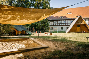 Das Außengelände für unsere Allerkleinsten: Am Kindergartengebäude befindet sich ein Garten mit einem Sandkasten, Rasenflächen mit verschiedenen Wipptieren sowie