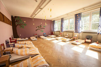 Durch Umgestaltung der ehemaligen Schulspeisung, entstand 2012 ein großzügiger Bewegungsraum für Sport, Spiel, Tanz und ausreichend Bewegung. Aber auch für Feste und Veranstaltungen wird dieser großartige Raum genutzt.