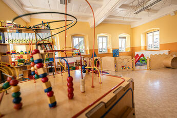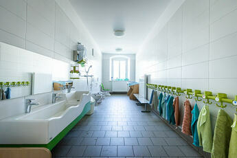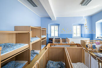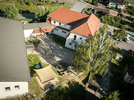Die Kinderkrippe und der Kindergarten befinden sich in einem Ziegelbau. Dabei steht jeder Gruppe ein großzügiger und heller Gruppenraum, mit separater Garderobe zur Verfügung.