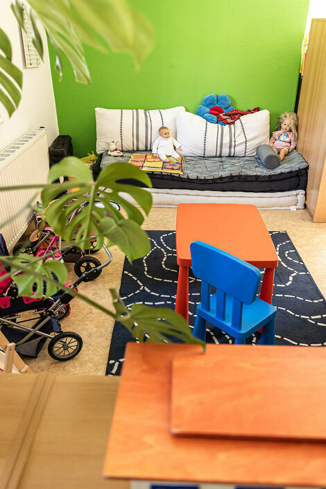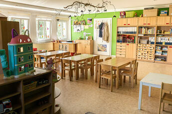 Nach den Bedürfnissen der Kinder sind die Räume liebevoll gestaltet. Eine feste Erzieherin begleitet die Gruppe jeweils ein Kindergartenjahr.